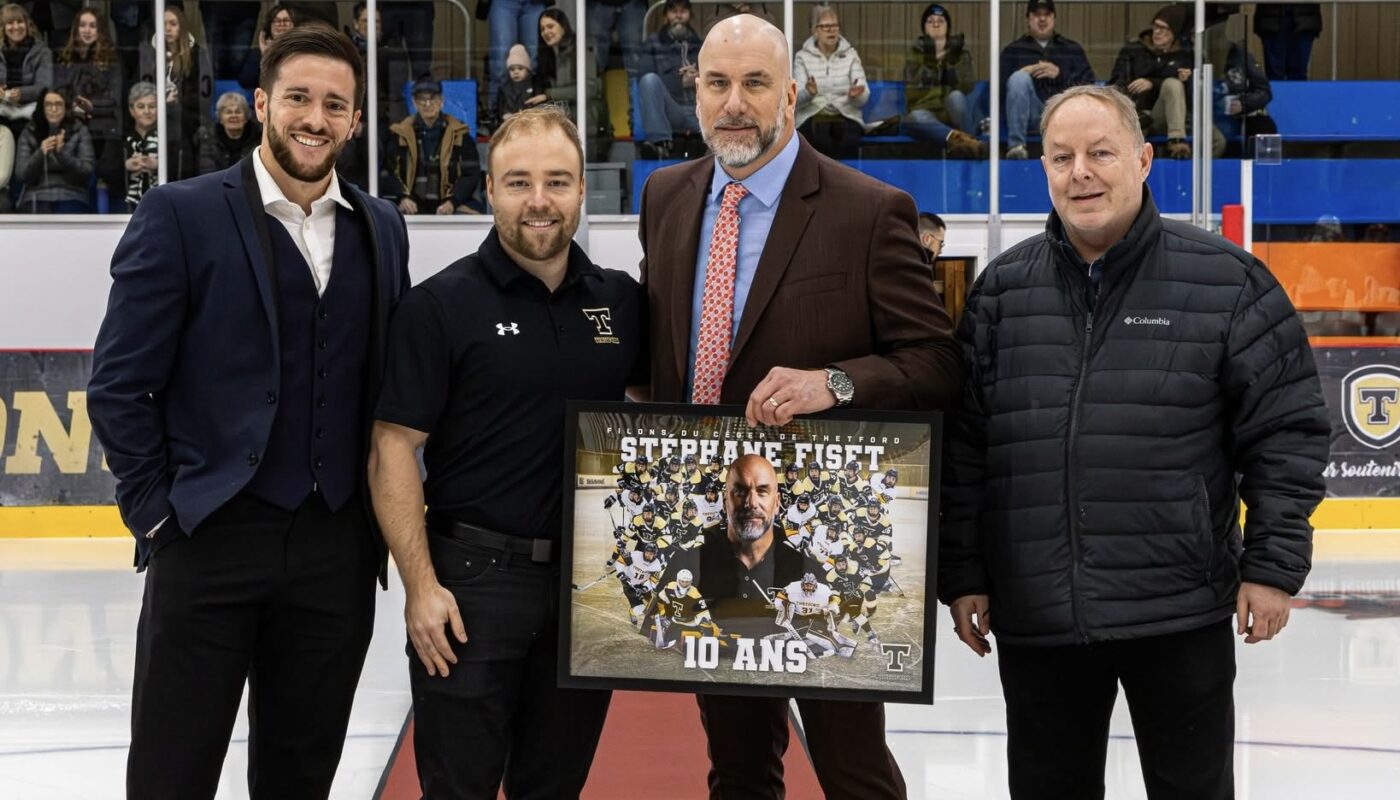 L’entraîneur adjoint-Stéphane Fiset a d’abord été honoré pour ses dix années d’implication avec le programme. En poste depuis une décennie, il fait partie du personnel derrière le banc et contribue au développement quotidien des joueurs.